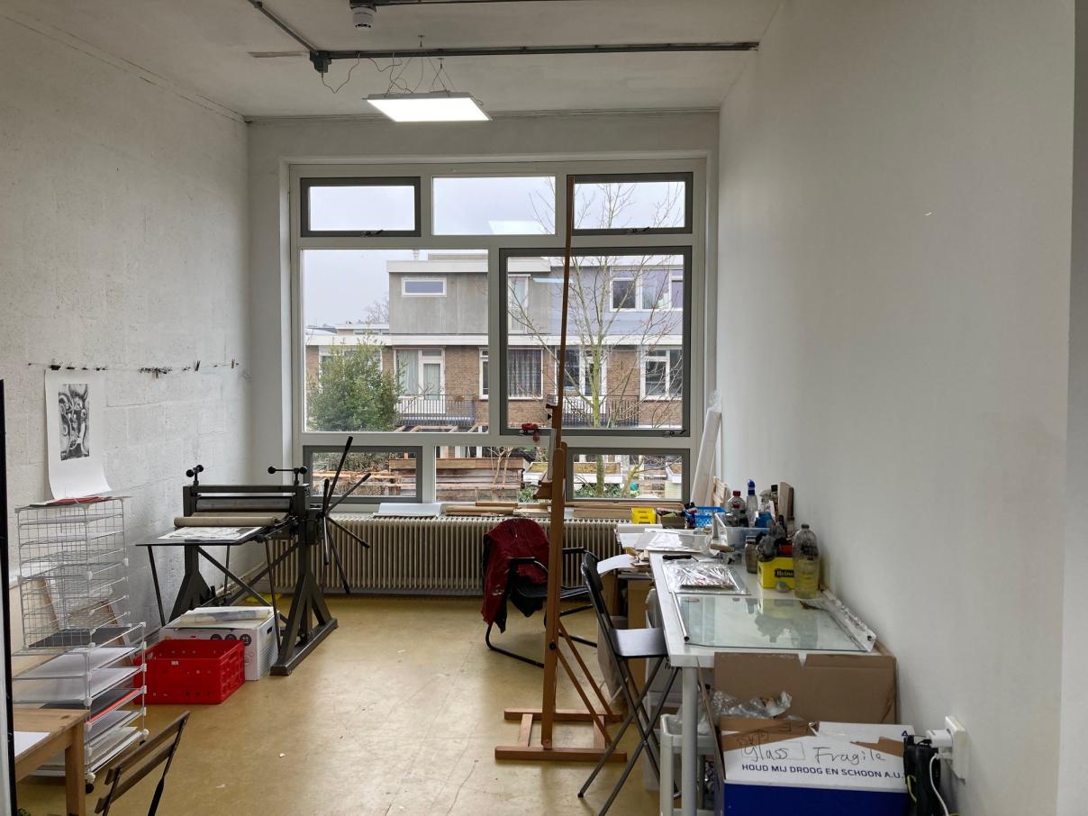 Deze werkruimte van 34,4 m² is per 1 april 2026 beschikbaar en gelegen op de eerste verdieping. De ruimte biedt uitzicht op een rustige woonwijk en beschikt over grote raampartijen aan zowel de oost- als westzijde. Hierdoor is er gedurende de hele dag volop natuurlijk licht, wat de ruimte bijzonder geschikt maakt voor bijvoorbeeld beeldend kunstenaars of schilders.