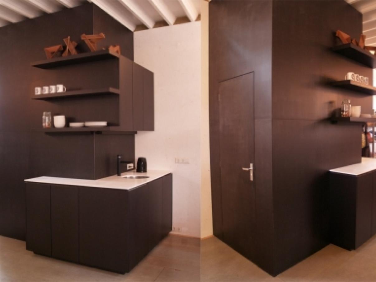 Het atelier bestaat uit een werkplaats van 76 m2 en een kantoor van 76 m2 die van elkaar gescheiden zijn. Van beide ruimtes is ¼ beschikbaar. De kantoorruimte is voorzien van een keukentje, toilet en een gedeelde lunch/ bespreektafel.